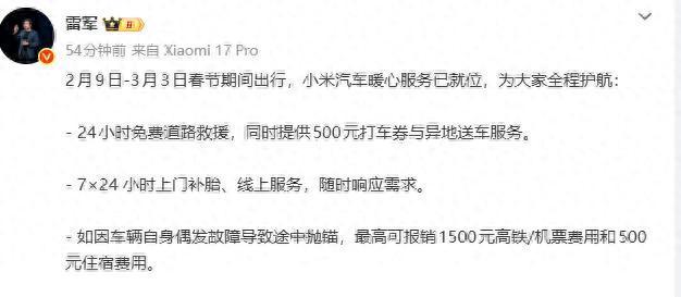 2月6日,小米创始人雷军发微博称,2月9日-3月3日春节期间出行,小米汽车将开启三项暖心服务,包括24小时免费道路救援,同时提供500元打车券与异地送车服务;7×24 小时上门补胎、线上服务;和如因车辆自身偶发故障导致途中抛锚,最高可报销1500元高铁/机票费用和500元住宿费用服务。