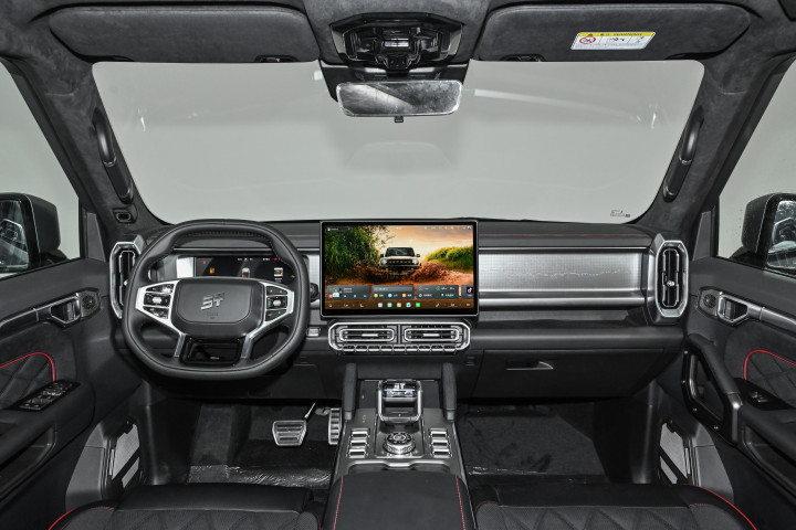 坐进车内,内饰的硬派风格和外观很搭。64 英寸的全景大天窗是个加分项。硬派多功能方向盘的造型很有未来感,握感也很扎实,转动时的阻尼感很均匀,指向性也比较精准。